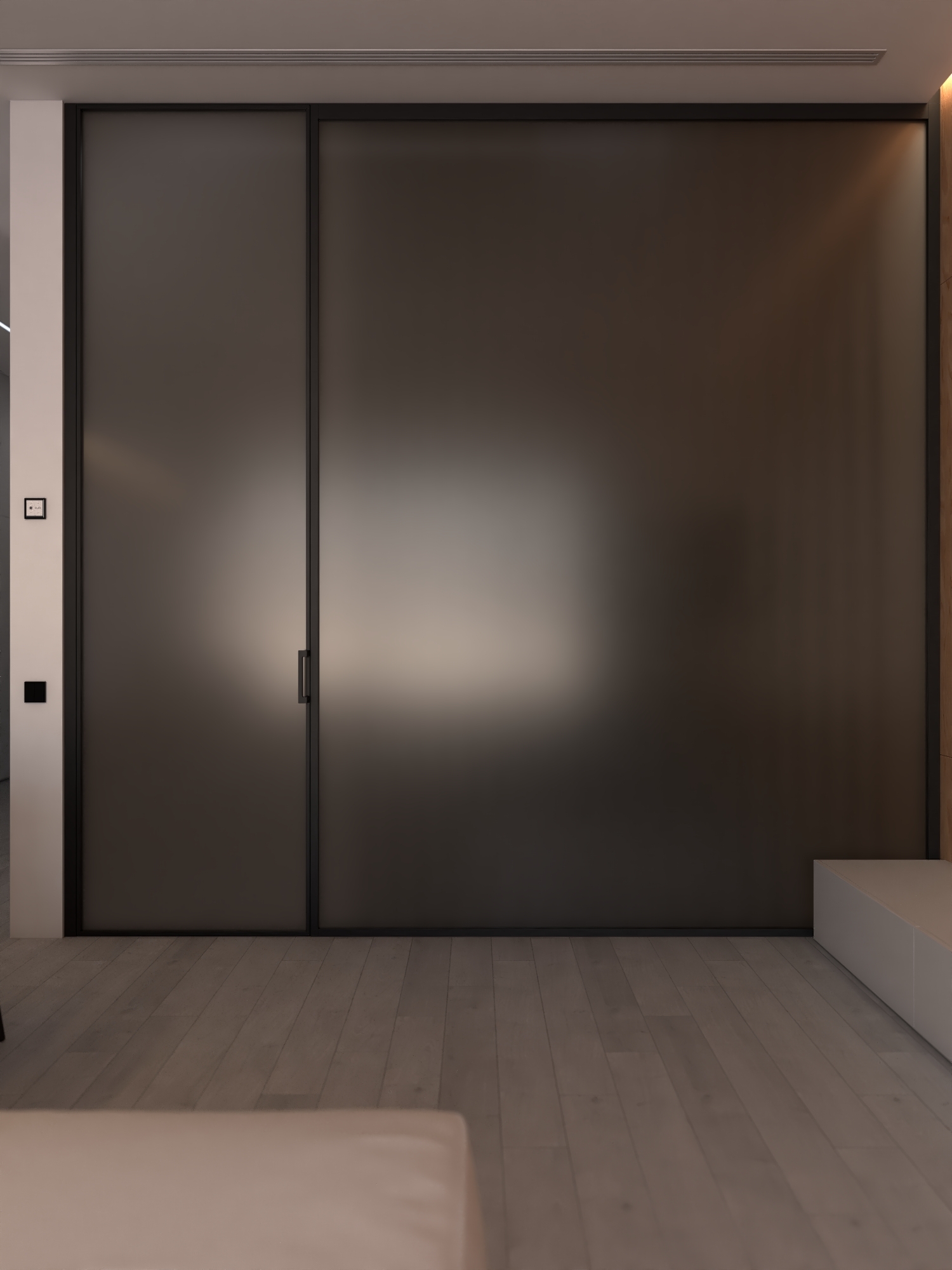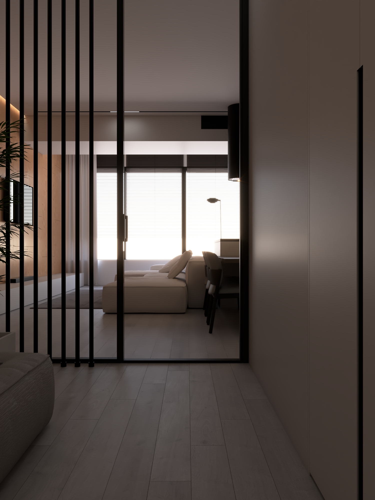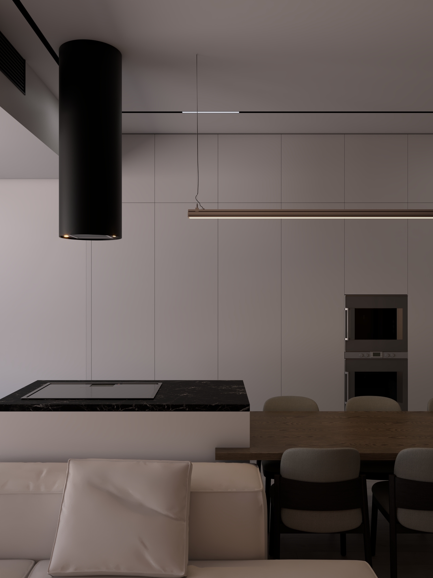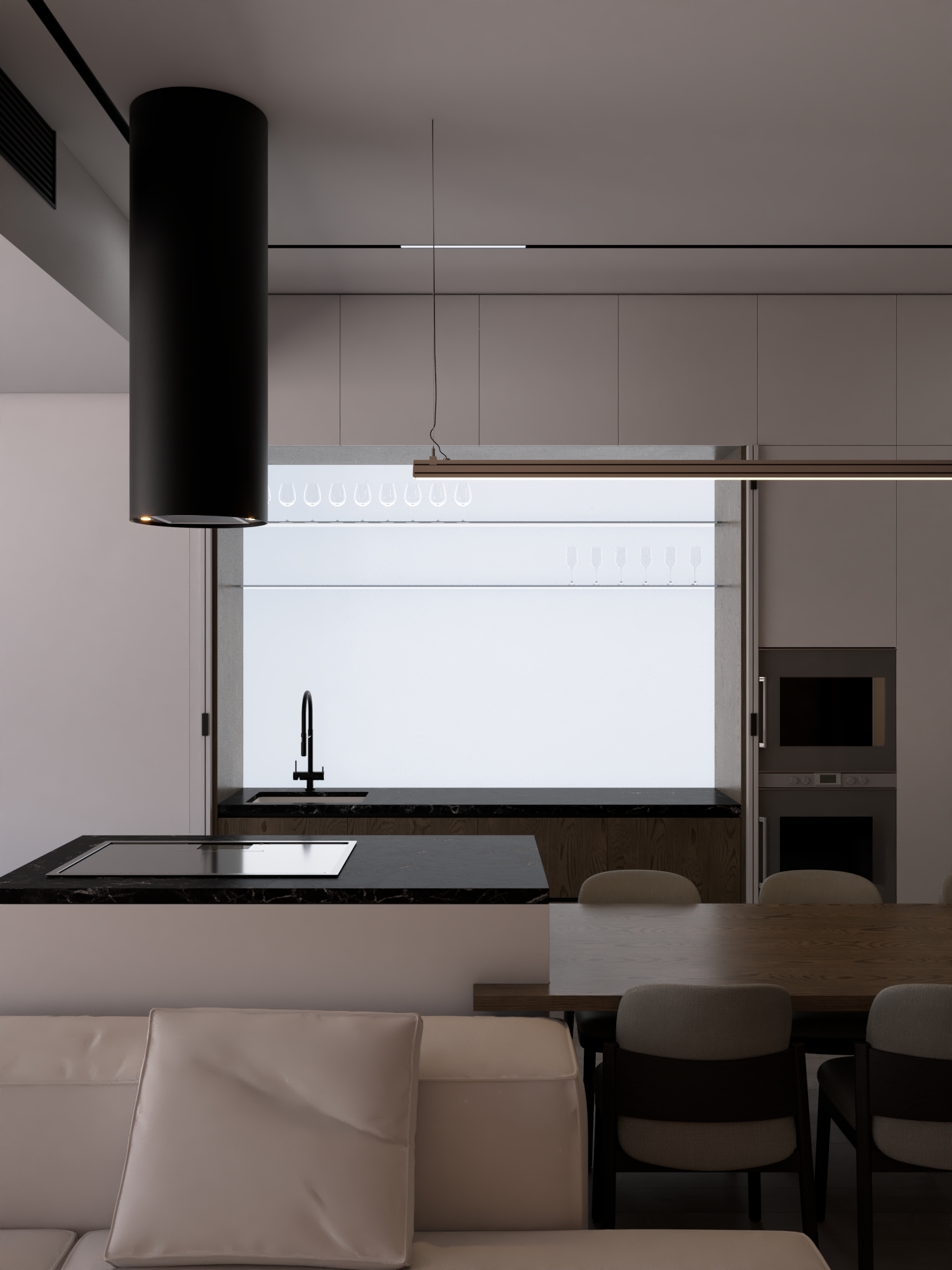 КЛЮЧЕВОЕ РЕШЕНИЕ ПРОЕКТА — ПОЛНОСТЬЮ СКРЫТАЯ КУХНЯ СО СВЕТОВОЙ СТЕНОЙ ИЗ МАТОВОГО ПОЛОТНА И РЕГУЛИРУЕМОЙ LED-ПОДСВЕТКОЙ, ПОЗВОЛЯЮЩЕЙ МЕНЯТЬ АТМОСФЕРУ ПРОСТРАНСТВА ОТ РАБОЧЕГО ДО ВЕЧЕРНЕГО СЦЕНАРИЯ.