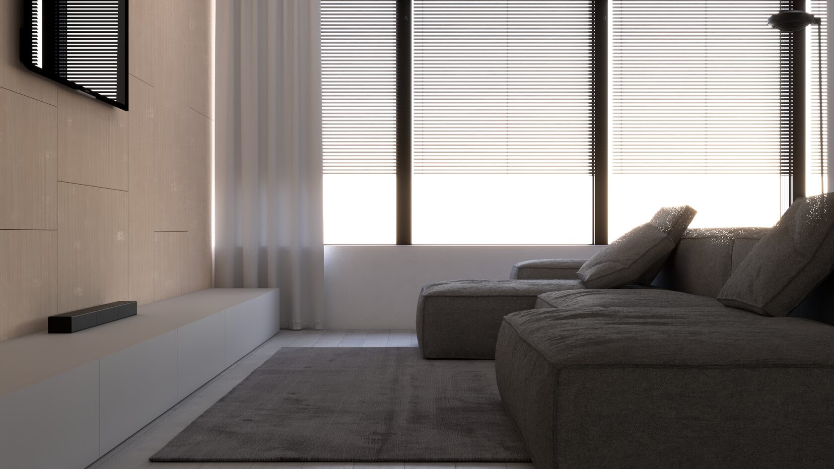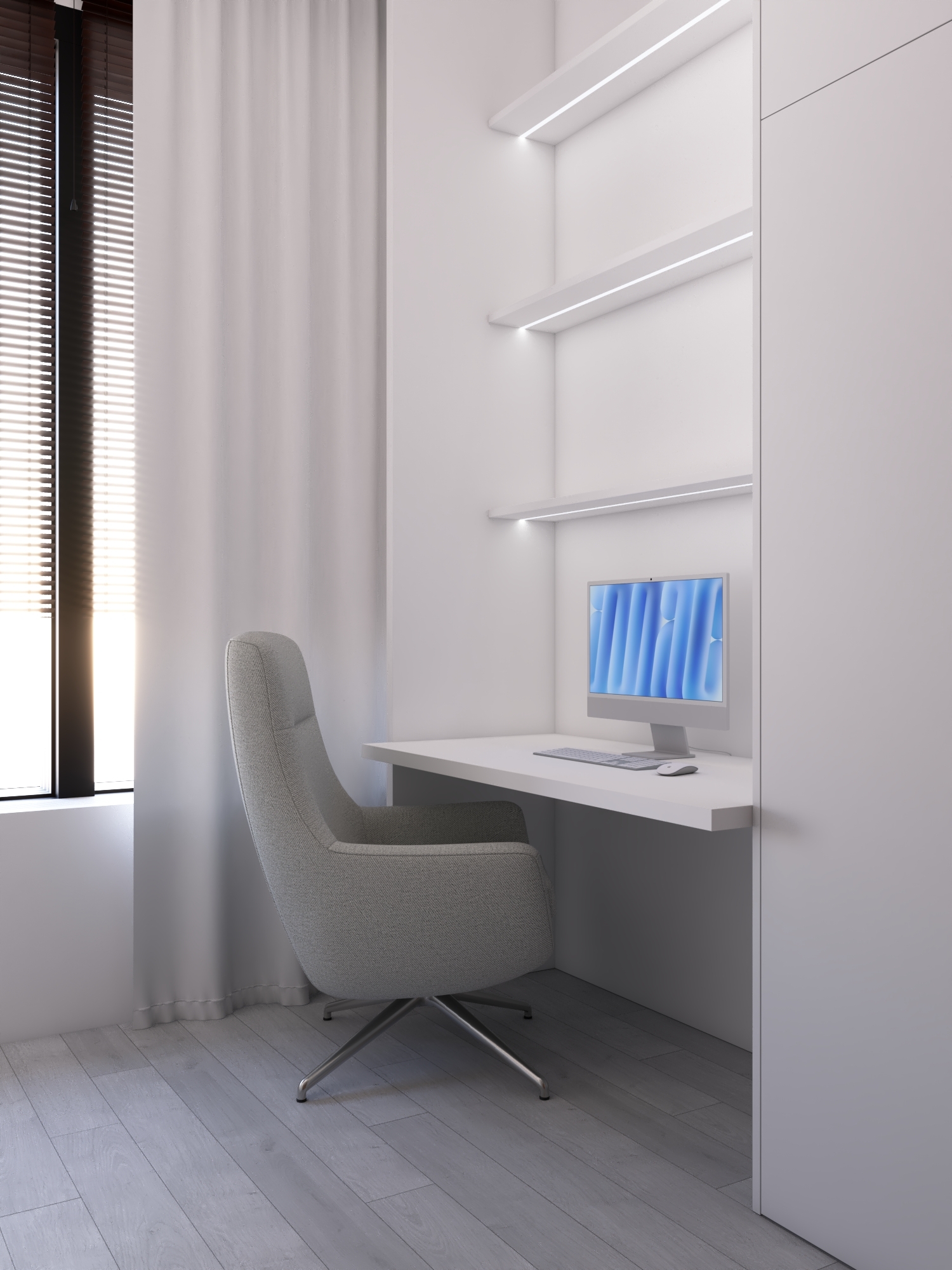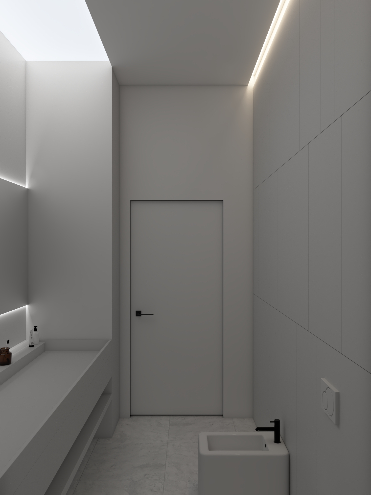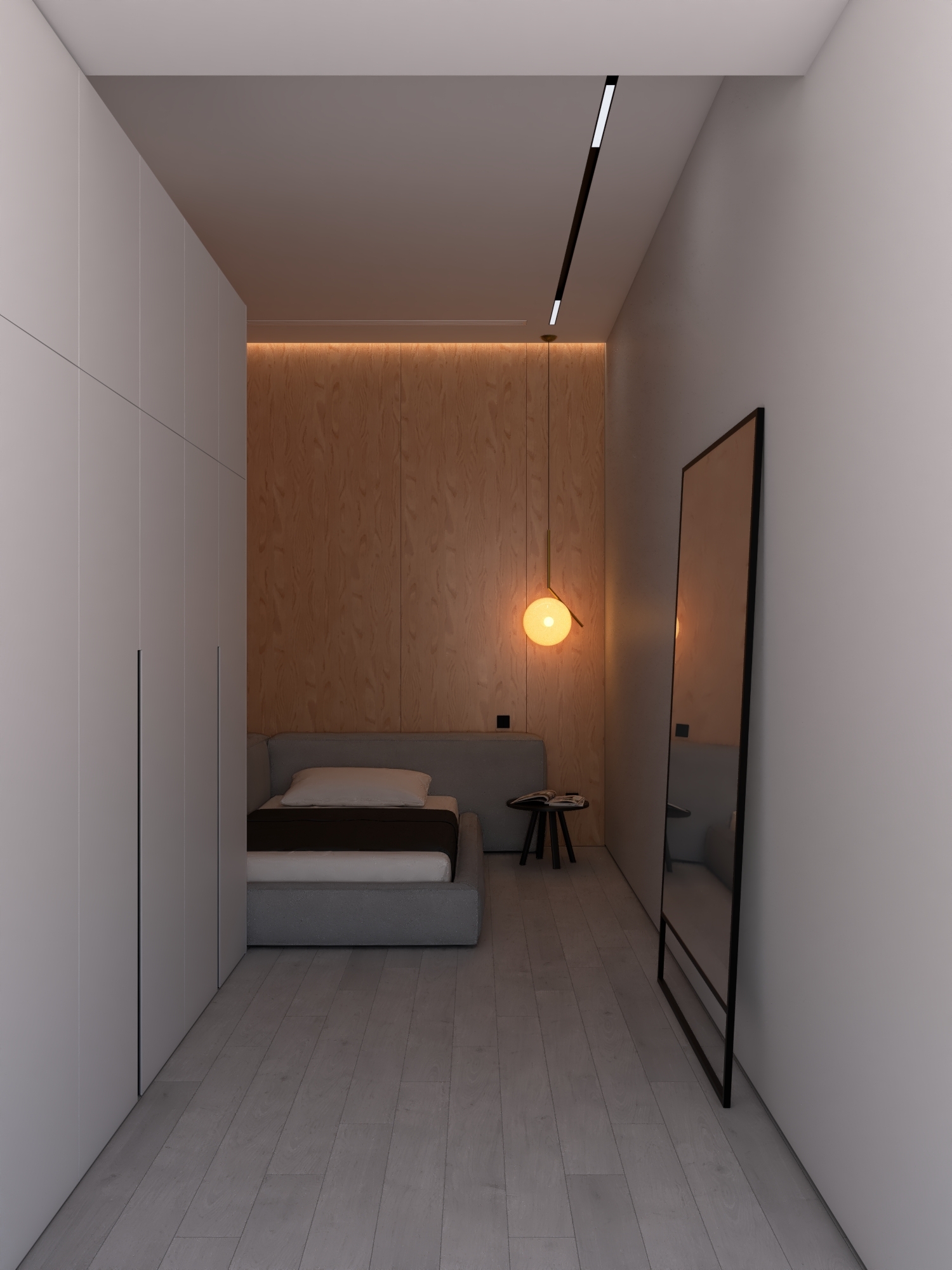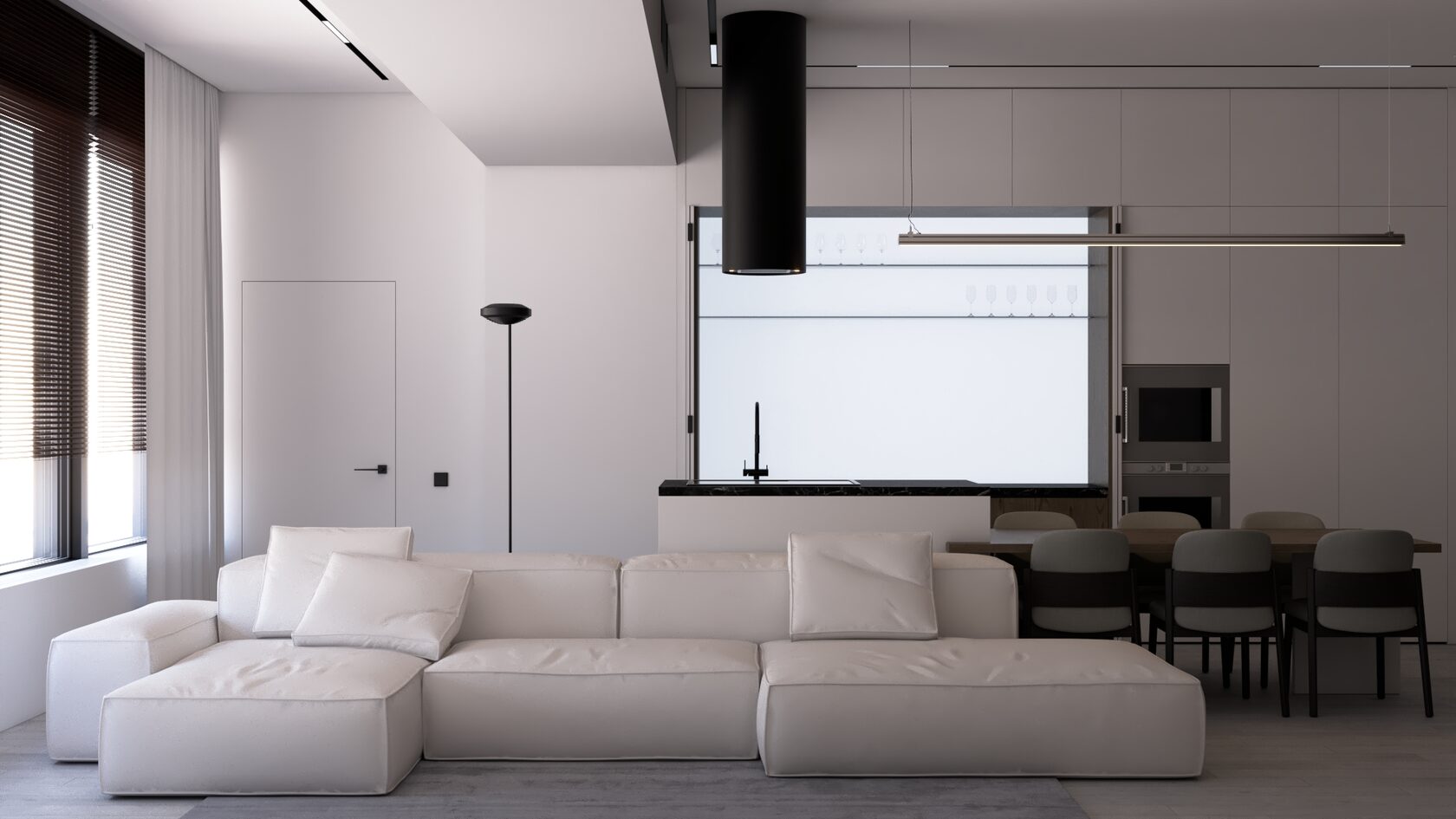 КЛЮЧЕВОЕ РЕШЕНИЕ ПРОЕКТА — ПОЛНОСТЬЮ СКРЫТАЯ КУХНЯ СО СВЕТОВОЙ СТЕНОЙ ИЗ МАТОВОГО ПОЛОТНА И РЕГУЛИРУЕМОЙ LED-ПОДСВЕТКОЙ, ПОЗВОЛЯЮЩЕЙ МЕНЯТЬ АТМОСФЕРУ ПРОСТРАНСТВА ОТ РАБОЧЕГО ДО ВЕЧЕРНЕГО СЦЕНАРИЯ.