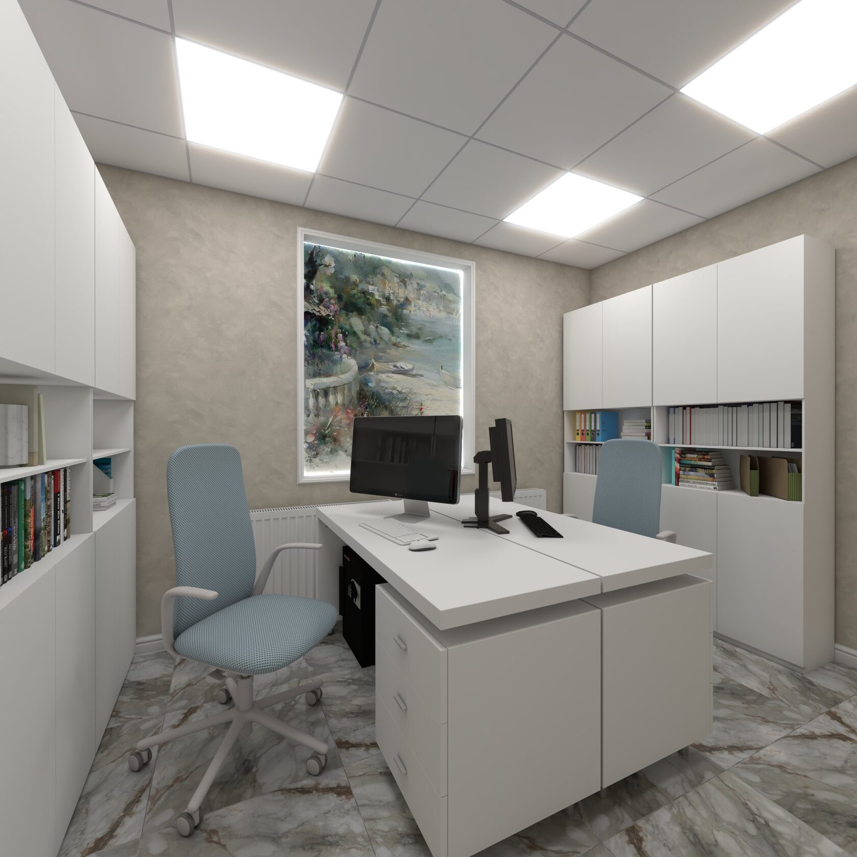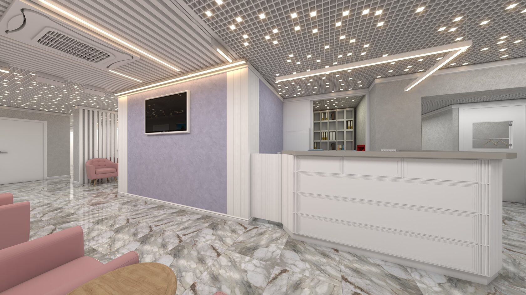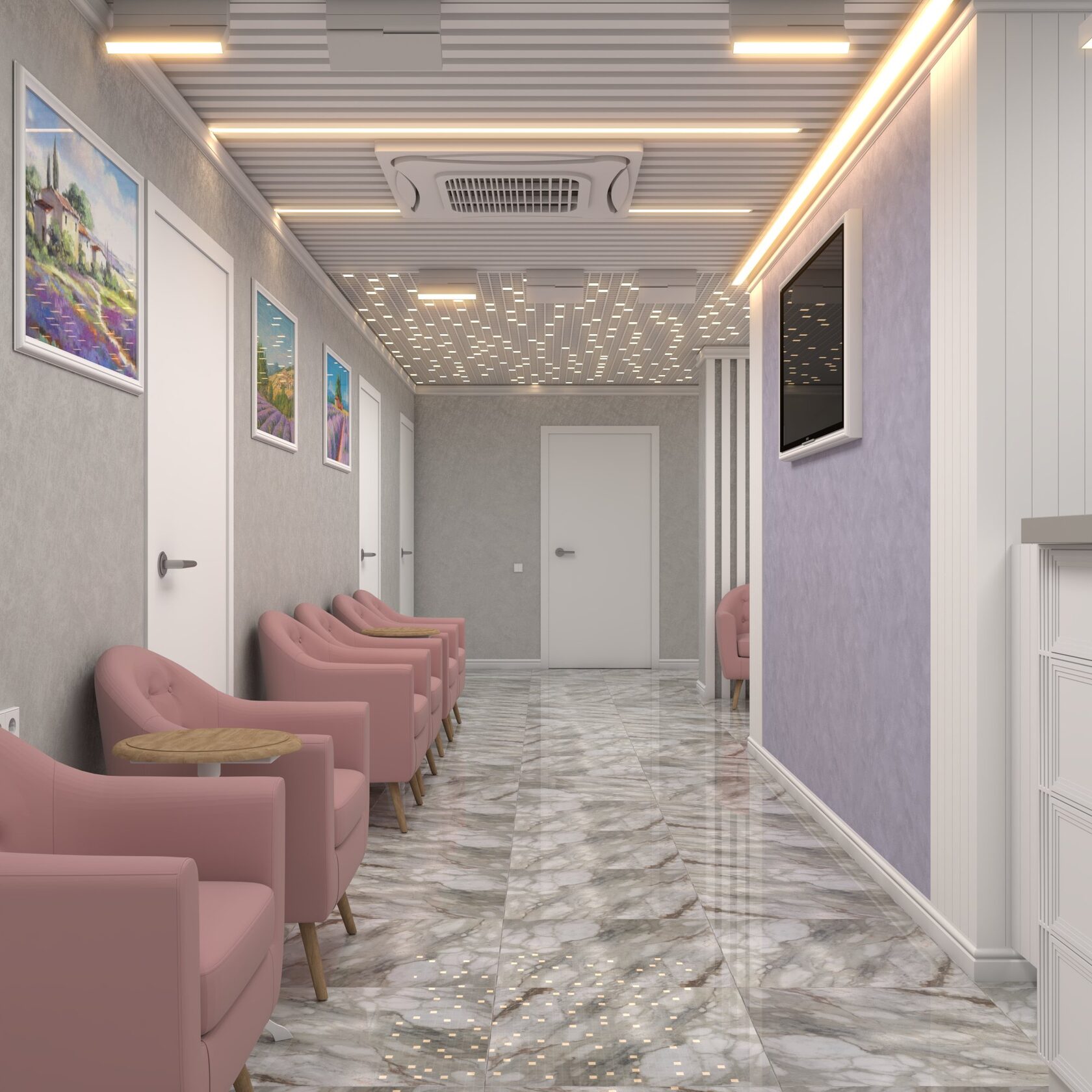 ПРОСТРАНСТВО ОФОРМЛЕНО В СПОКОЙНОЙ НЕЙТРАЛЬНОЙ ПАЛИТРЕ — ОТТЕНКИ СЕРОГО И БЕЖЕВОГО СОЗДАЮТ ОЩУЩЕНИЕ ЧИСТОТЫ, УРАВНОВЕШЕННОСТИ И ДОВЕРИЯ, ЧТО ОСОБЕННО ВАЖНО В МЕДИЦИНСКОЙ СРЕДЕ.